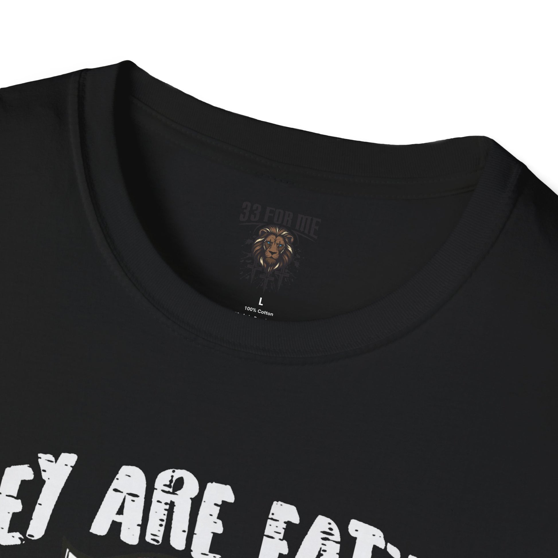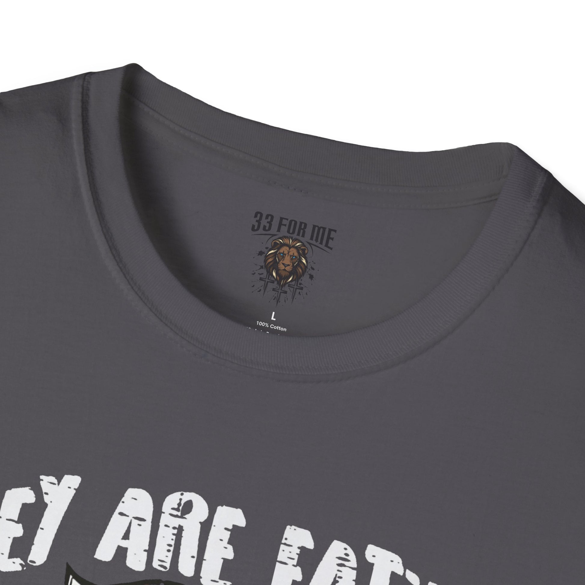 This Funny Thanksgiving Unisex T-Shirt features a design of Trump Turkey with the quote 'They Are Eating the Turkeys'. Perfect for adding a humorous touch to your Thanksgiving celebrations. This shirt is for adults and is made from durable and smooth fabric, ideal for printing. It is relevant for Thanksgiving Day and holiday gatherings, suitable for those who enjoy unique and funny attire.