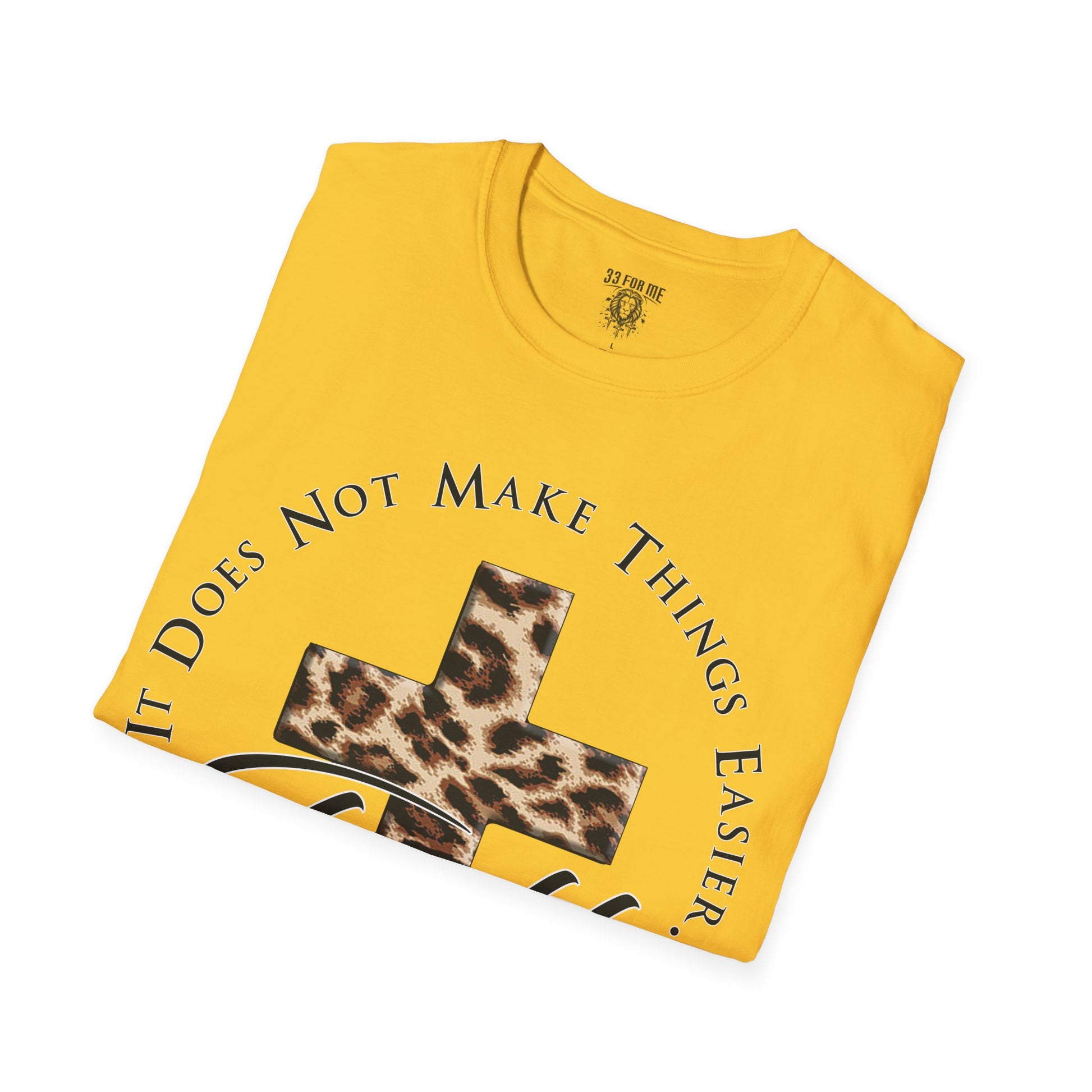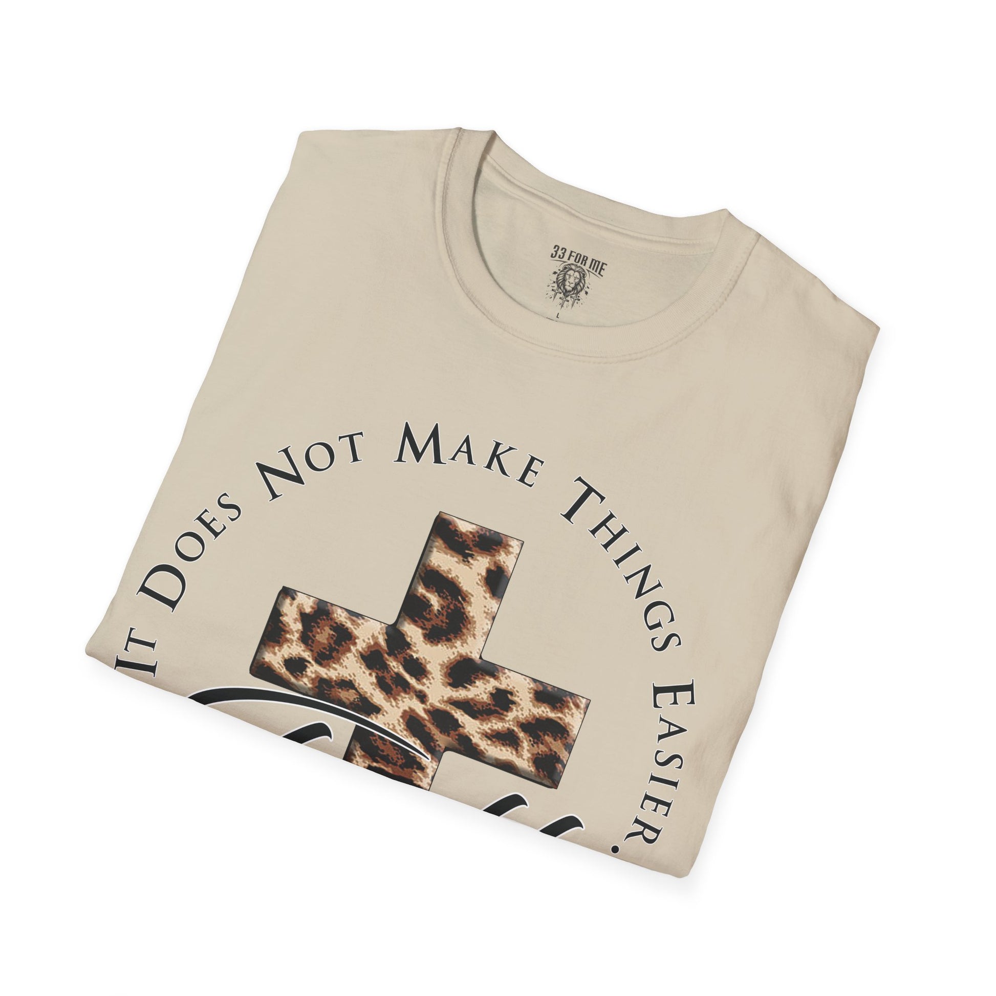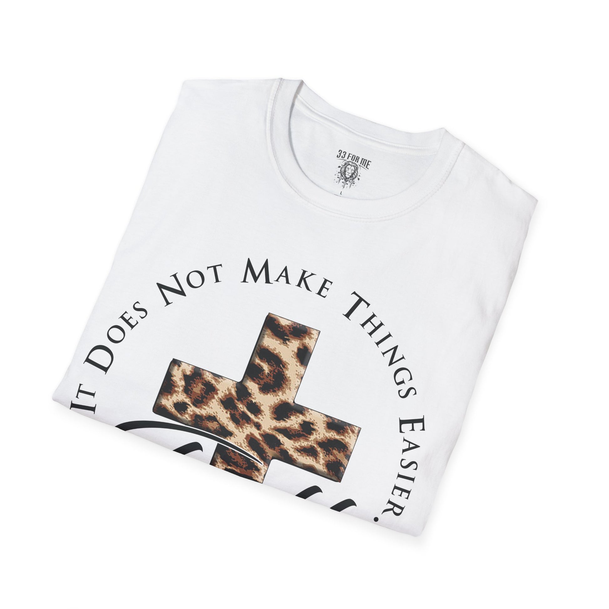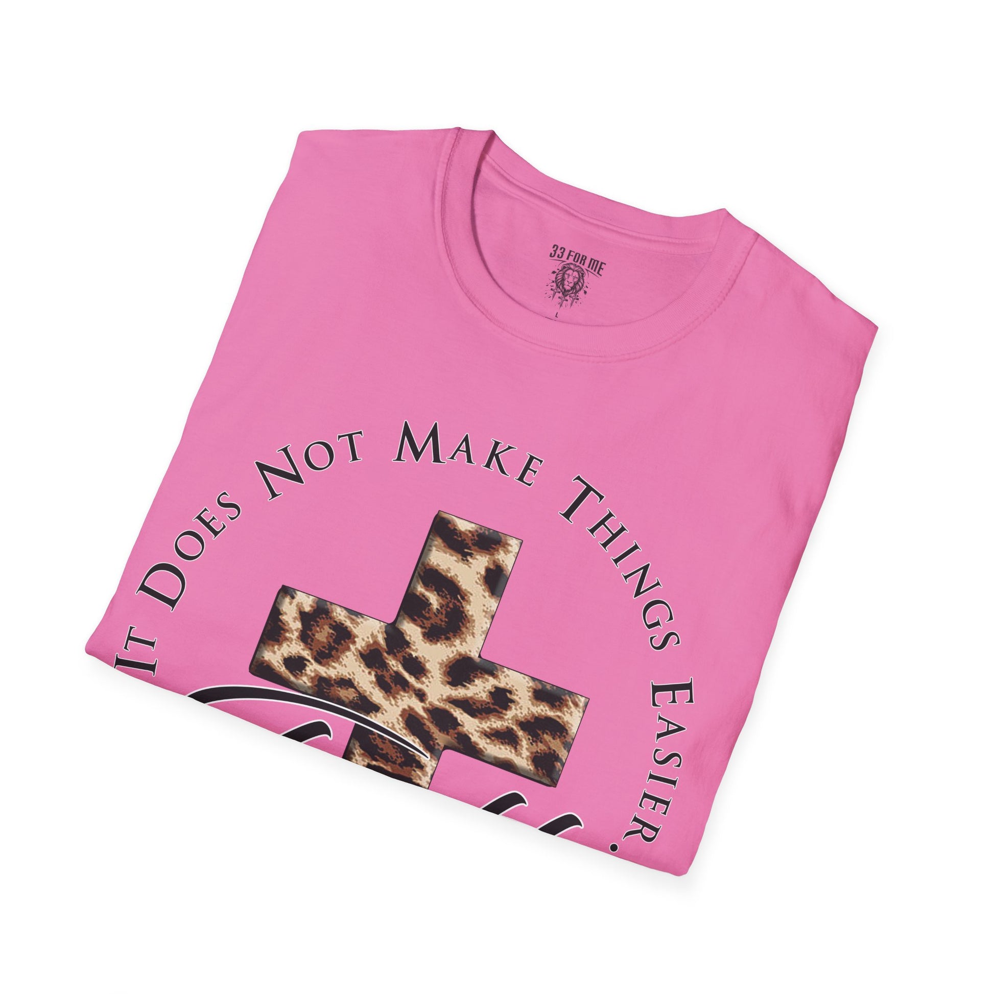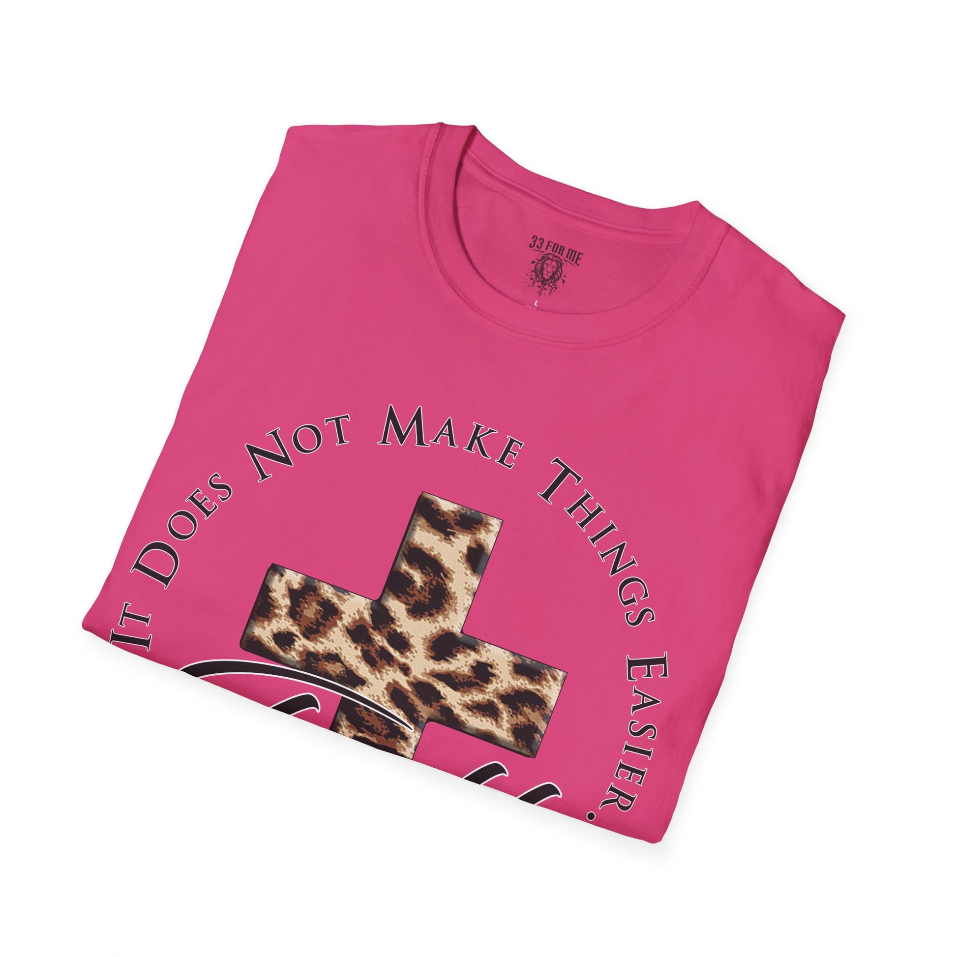 Embrace your faith with this stylish unisex softstyle t-shirt that seamlessly blends comfort and inspiration. Featuring a chic leopard print cross and motivational text, this tee offers a casual yet uplifting vibe. Perfect for daily wear, it adds a special touch to any casual outfit. Whether you're attending church, a family gathering, or simply running errands, this shirt serves as a reminder to stay positive and grounded. It makes an ideal gift for friends or loved ones celebrating holidays such as Easter, Christmas, or any occasion needing a boost of faith and encouragement. Ideal for adults who appreciate both style and spirituality, this t-shirt enhances your wardrobe with a message that resonates.