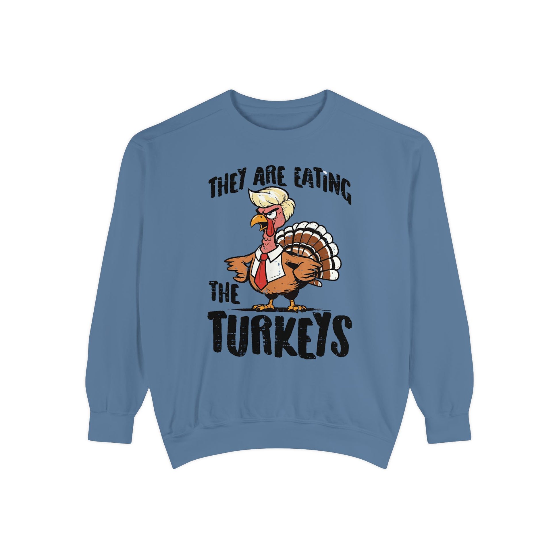 This Thanksgiving Trump humor sweatshirt with the phrase 'They Are Eating The Turkeys' exudes a playful and festive vibe, perfect for those with a quirky sense of humor. Ideal for Thanksgiving celebrations or for anyone looking to add a touch of humor to their wardrobe. Suitable for adults.